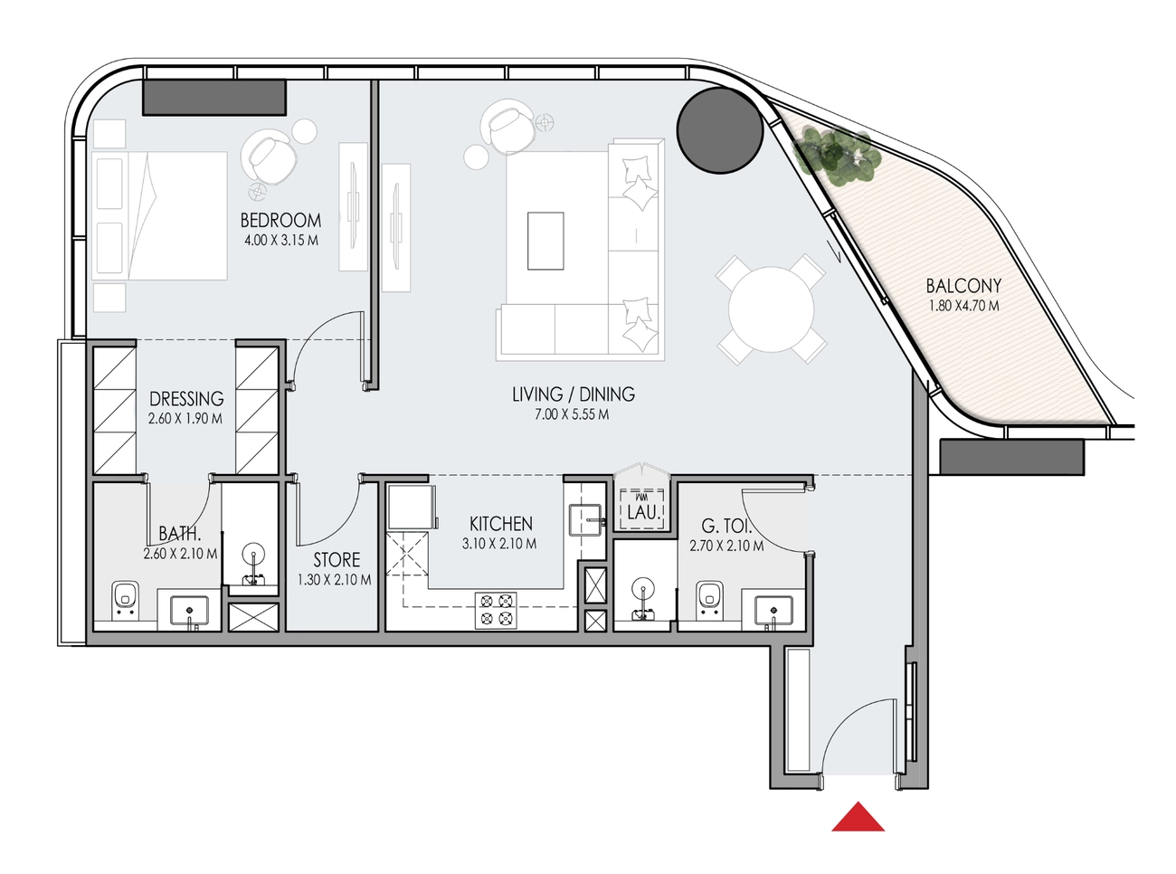 • حلول التخزين: تتميز هذه الشقق المكونة من غرفة نوم واحدة بتصميم فريد من نوعه، حيث تشتمل على غرفة تخزين مخصصة (1.30 × 2.10 م) وخزانة غسيل منفصلة للحفاظ على مساحة المعيشة خالية من الفوضى.