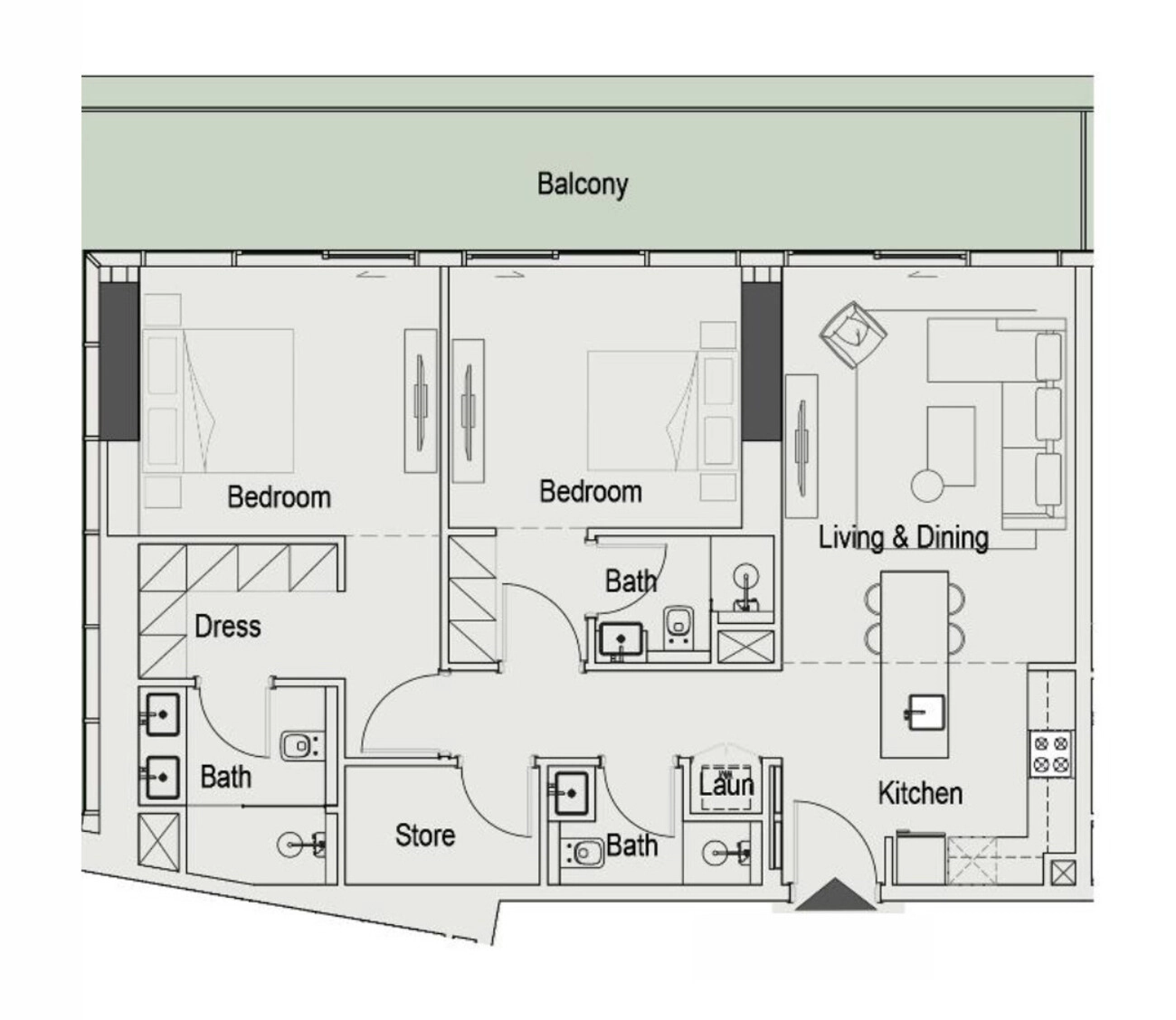 • منطقة معيشة وطعام مفتوحة تطل على الشرفة لتوفير الإضاءة الطبيعية والتدفق.