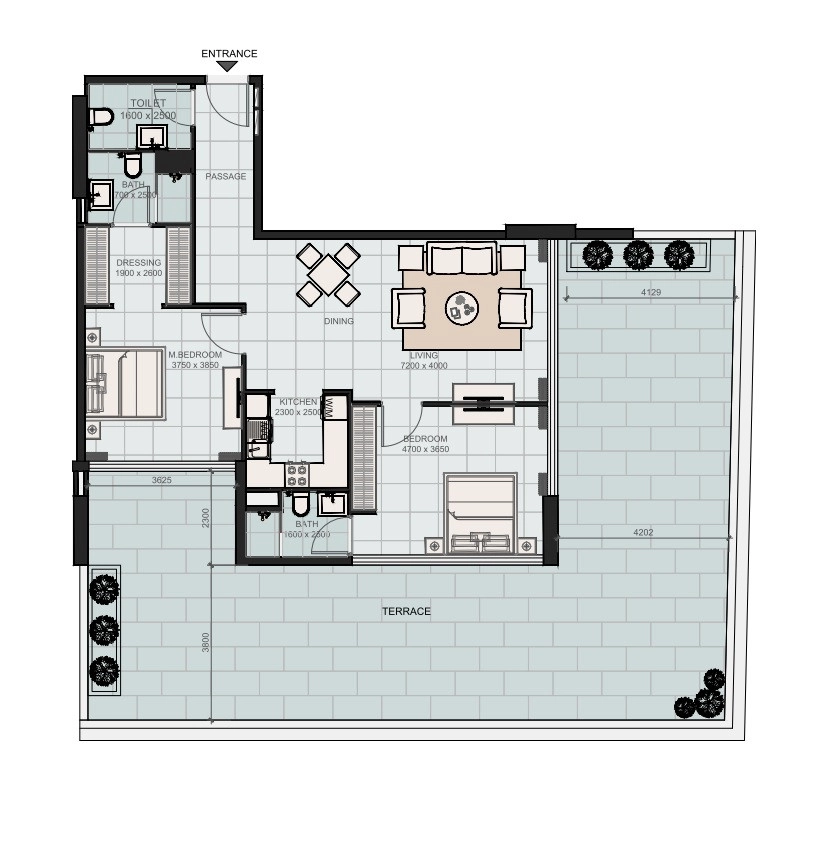 المزايا: منطقة المعيشة وتناول الطعام ذات التصميم المفتوح (7.2 م × 4.0 م) واسعة للغاية، مما يجعلها مثالية للحياة اليومية والترفيه. يضمن الموقع الزاوي والزجاج الكبير أن تغمر الشقة الضوء الطبيعي من عدة جوانب، مما يوفر تصميمات داخلية مشرقة وجيدة التهوية.