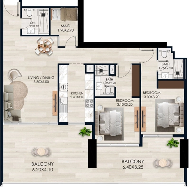 خلوات مزدوجة في الهواء الطلق: على عكس الشقق العادية، تتميز هذه الوحدة بشرفتين واسعتين (بمساحة 6.20 × 4.10 م و6.40 × 3.25 م على التوالي). توفر هذه الشرفات الضخمة مساحة واسعة لتناول الطعام في الهواء الطلق أو الاسترخاء أو إنشاء حديقة خاصة.