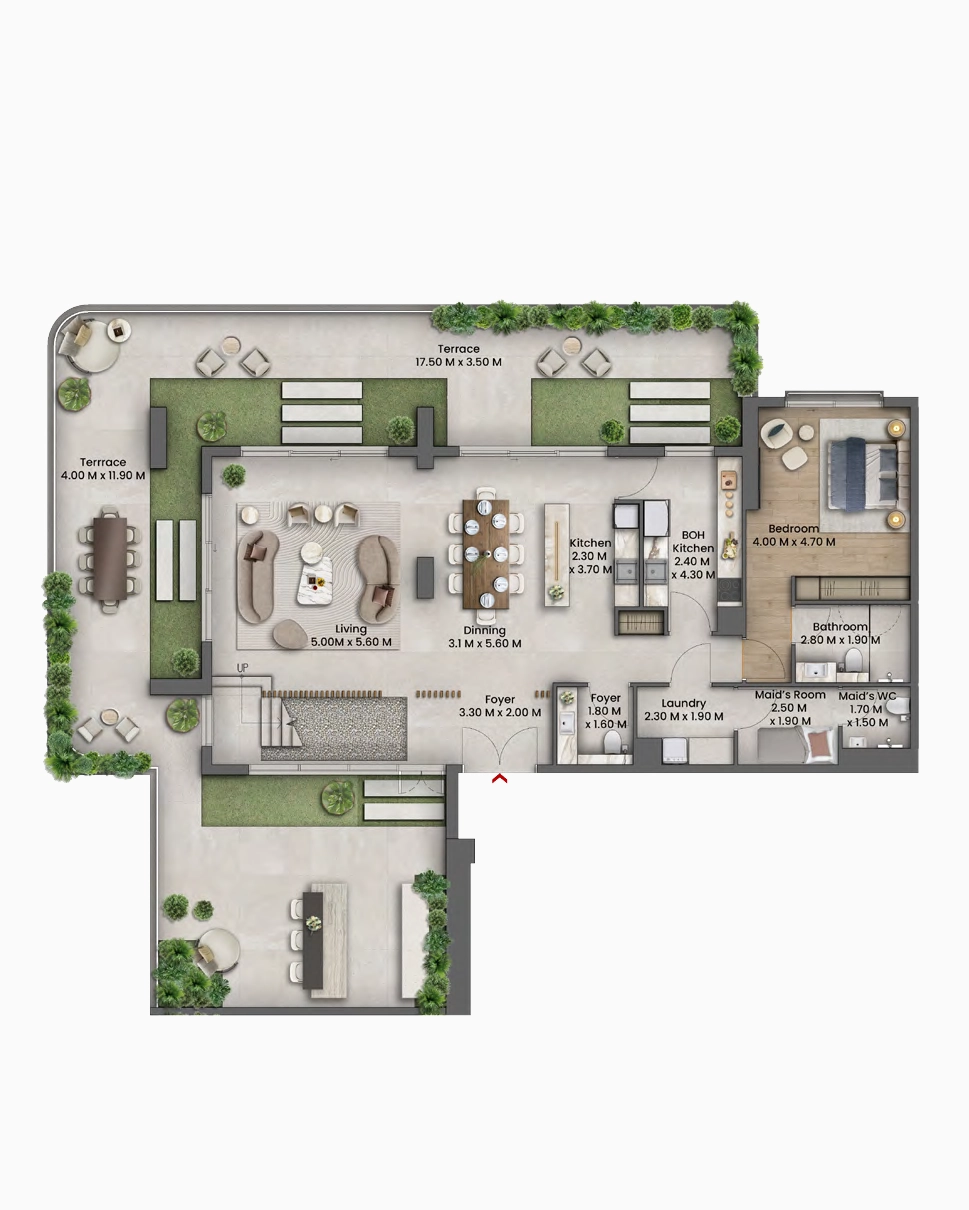 شرفة ضخمة ملفوفة حول الشرفة: الطابق السفلي محاط بمساحة خارجية ضخمة على شكل حرف L، تضم شرفة رئيسية (17.50 x 3.50 م) وشرفة جانبية (4.00 x 11.90 م)، مما يوفر إمكانات هائلة للحدائق الخاصة وتناول الطعام في الهواء الطلق.