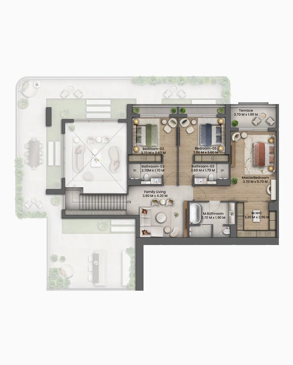 الملاذ الخاص (الطابق العلوي): يؤدي الدرج إلى صالة جلوس عائلية مخصصة للمعيشة العائلية (3.90 x 4.20 م)، تفصل أماكن النوم عن المناطق الاجتماعية بالأسفل. غرفة النوم الرئيسية (3.70 x 5.70 م) تحفة فنية مع شرفة خاصة وحمام رئيسي فخم (3.70 x 1.90 م)، وخزانة ملابس ضخمة (3.20 x 2.90 م).