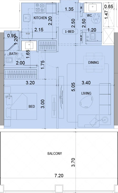 Zwei Bäder: Wie es bei Wohnungen mit einem Schlafzimmer selten der Fall ist, gibt es hier zwei Badezimmer: ein komplettes Hauptbadezimmer (2,00 m x 1,65 m) in der Nähe des Schlafzimmers und ein separates Gäste-WC (1,20 m x 2,50 m) im Eingangsbereich, das dem Bewohner absolute Privatsphäre bietet.