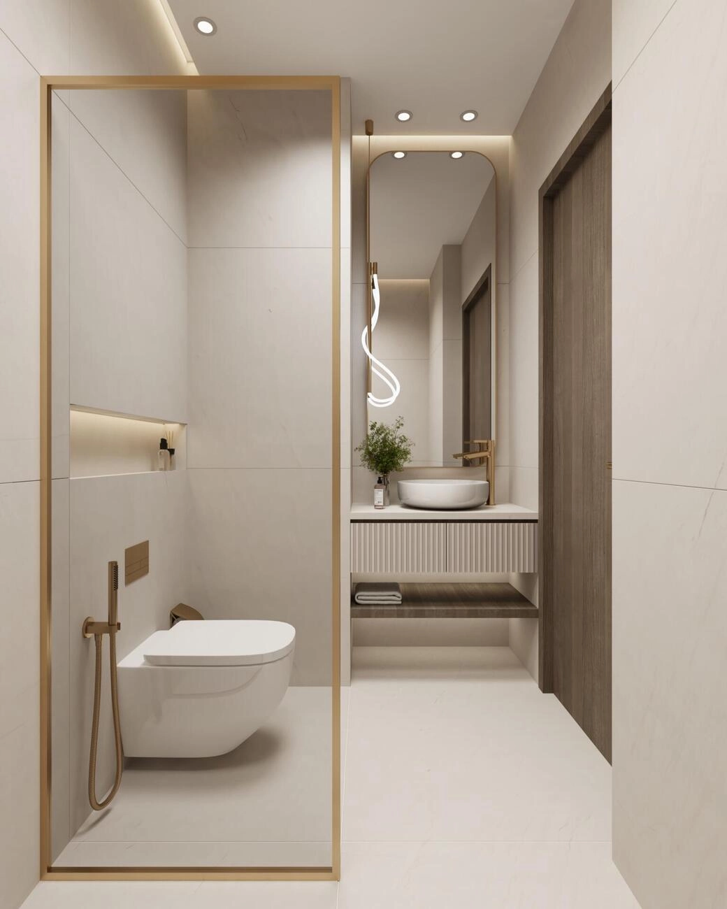 Entwurf: Bodengleiche Fliesen in den Nassbereichen und eine elegante “Ceramic Limit” in der Küche grenzen die Zonen elegant ab, ohne den Raum zu verschließen.