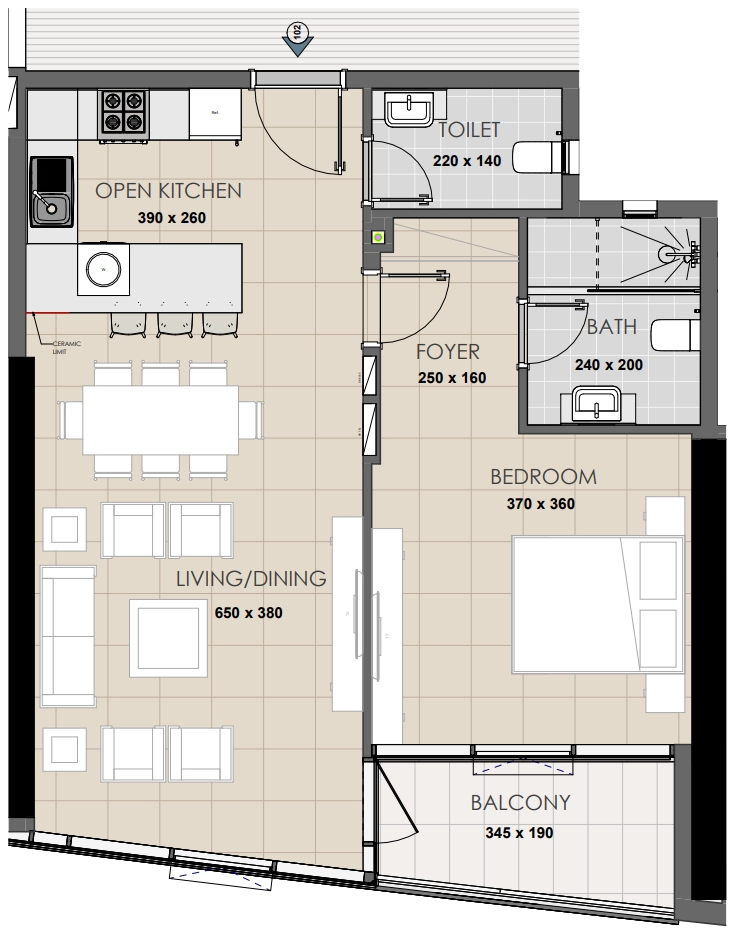 Komfort für Gäste: Im Gegensatz zu Standard-Einzelzimmerwohnungen verfügt dieser Grundriss über ein separates Gäste-WC/Bad (220 x 140) in der Nähe des Foyers, so dass die Privatsphäre der Master-Suite gewährleistet ist.