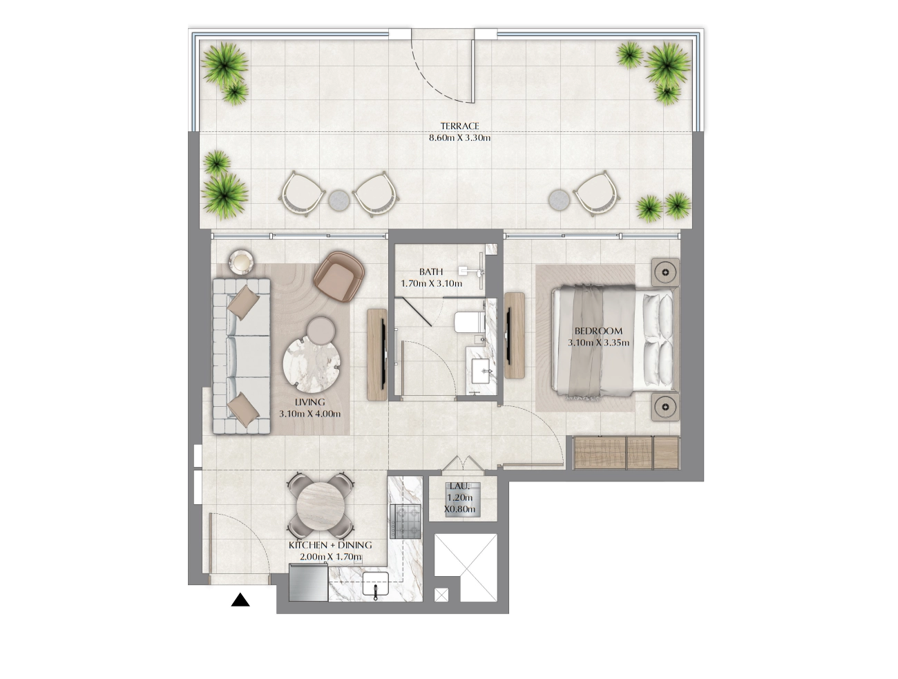 Vorteile: Das Schlafzimmer ist vom Wohnbereich getrennt, wodurch Privatsphäre und ein ruhiger Rückzugsort gewährleistet sind. Die offene Gestaltung zwischen Wohnzimmer und Küchen-/Essbereich schafft ein Gefühl von Geräumigkeit und ermöglicht eine flexible Möblierung. Die Terrasse sorgt für hervorragende natürliche Lichtverhältnisse und Belüftung, wodurch die gesamte Wohnung hell und luftig wirkt.