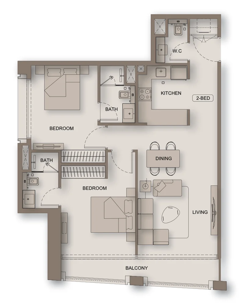 Diese 2-Schlafzimmer-Einheit ist auf Privatsphäre und sozialen Austausch ausgelegt und verfügt über einen Grundriss, der die aktiven Wohnbereiche von den ruhigen Schlafbereichen trennt.