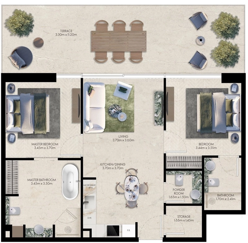 Vorteile: Der Grundriss bietet eine klare Trennung zwischen privaten und sozialen Bereichen. Die Schlafzimmer sind für Ruhe gruppiert, während das Wohnzimmer, die Küche und die Terrasse einen offenen, verbundenen Bereich für das tägliche Leben und Gäste schaffen. Die Einbeziehung einer Gästetoilette sorgt für zusätzlichen Komfort. Die Terrasse sorgt dafür, dass die Wohnung mit Tageslicht durchflutet ist.