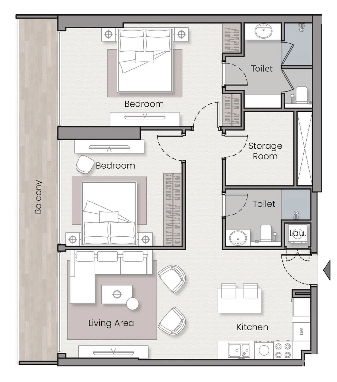Diese Konfiguration ist ideal für junge Berufstätige oder Studenten, die sich eine Wohnung teilen, sowie für kleine Familien. Die zwei Schlafzimmer und zwei Toiletten bieten die Privatsphäre und Funktionalität, die für ein harmonisches Zusammenleben erforderlich sind, und machen den Alltag reibungsloser und komfortabler.