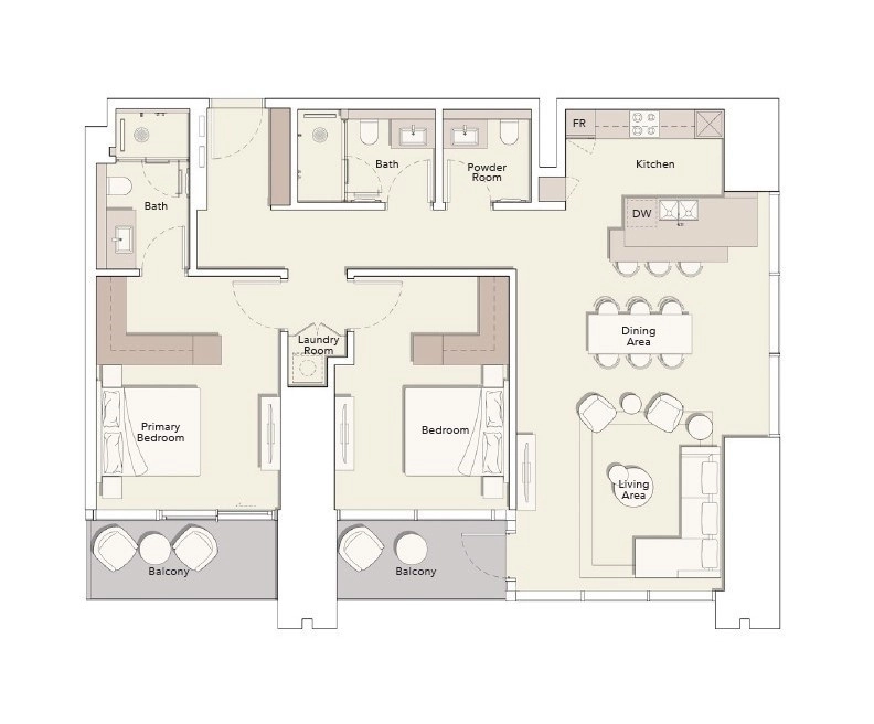 Die Wohnung verfügt über einen durchdachten Grundriss, der die großen Gemeinschaftsbereiche von den ruhigen, privaten Bereichen trennt und so maximalen Komfort für alle Bewohner gewährleistet: