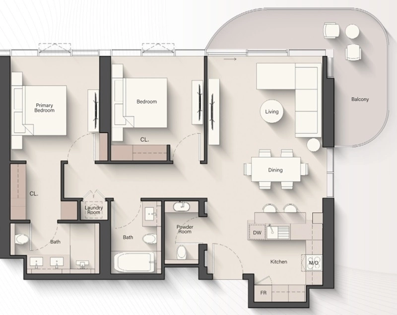 Die Primary Suite: Das Hauptschlafzimmer ist ein wahrer Zufluchtsort und verfügt über einen eigenen begehbaren Kleiderschrank (“CL”) und ein luxuriöses Badezimmer mit Doppelwaschbecken und einer großen Badewanne.