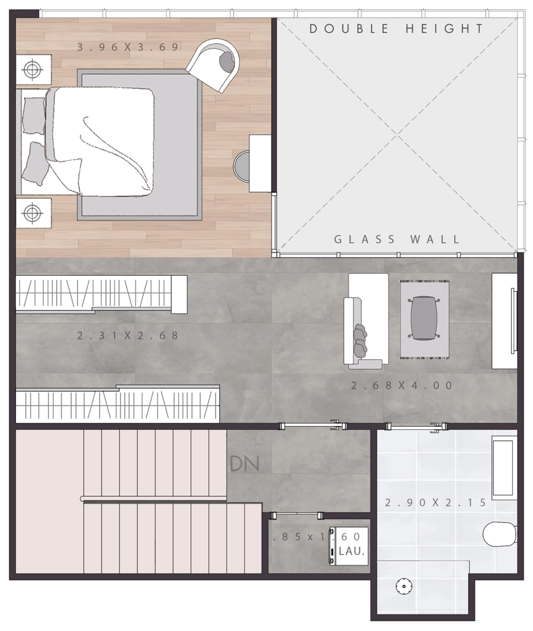 Doppelte Deckenhöhe: Das charakteristische Merkmal ist die doppelte Deckenhöhe über dem Wohnbereich mit einer Glaswand, die eine luftige, luxuriöse Atmosphäre schafft, wie man sie in Wohnungen selten findet.