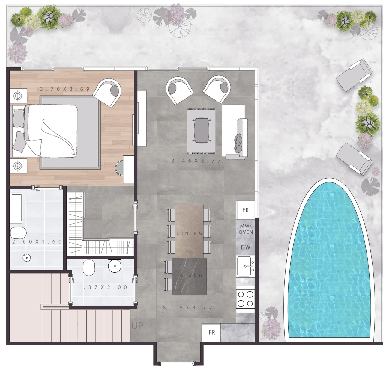 Paare und kleine Familien: Die Raumaufteilung bietet eine hervorragende funktionale Trennung. Das Schlafzimmer im Erdgeschoss eignet sich perfekt für Gäste oder ältere Kinder, während das Obergeschoss ein privater Rückzugsort bleibt. Der Pool bietet endlosen Spaß für Kinder und Erwachsene gleichermaßen.