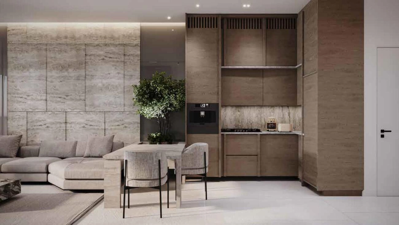 Premium-Räume: Die Wohnung verfügt über einen privaten Balkon, der perfekt positioniert ist, um den atemberaubenden Pool und die Wasserlandschaft zu überblicken. Der Grundriss bietet einen großzügigen offenen Wohn- und Essbereich, ideal für Gäste und den Alltag.