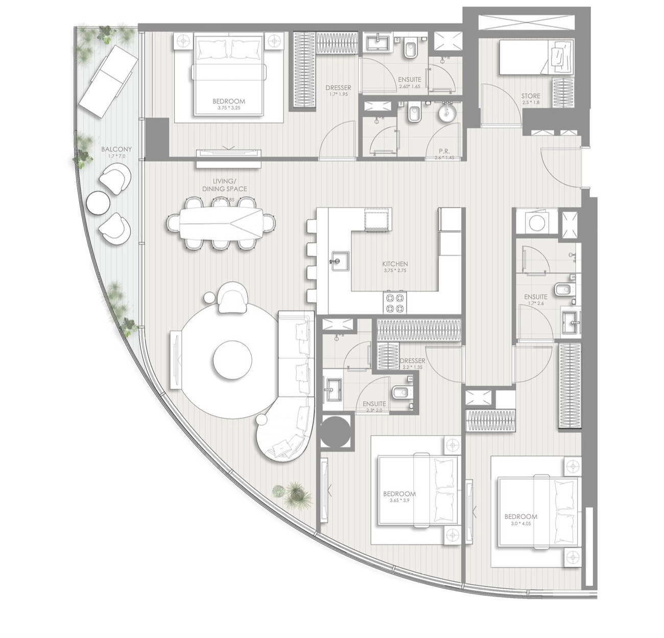 Dieses Layout ist ideal für Familien, die Privatsphäre und Unabhängigkeit suchen. Die Schlafzimmer mit eigenem Bad bieten Familienmitgliedern oder Gästen einen Rückzugsort und verhindern so morgendliche Engpässe. Die mehreren Ankleidezimmer bieten reichlich Stauraum, während der Balkon eine gemeinsame Oase im Freien darstellt – und das alles in der sicheren, luxuriösen Umgebung von ‘SOL Luxe’.