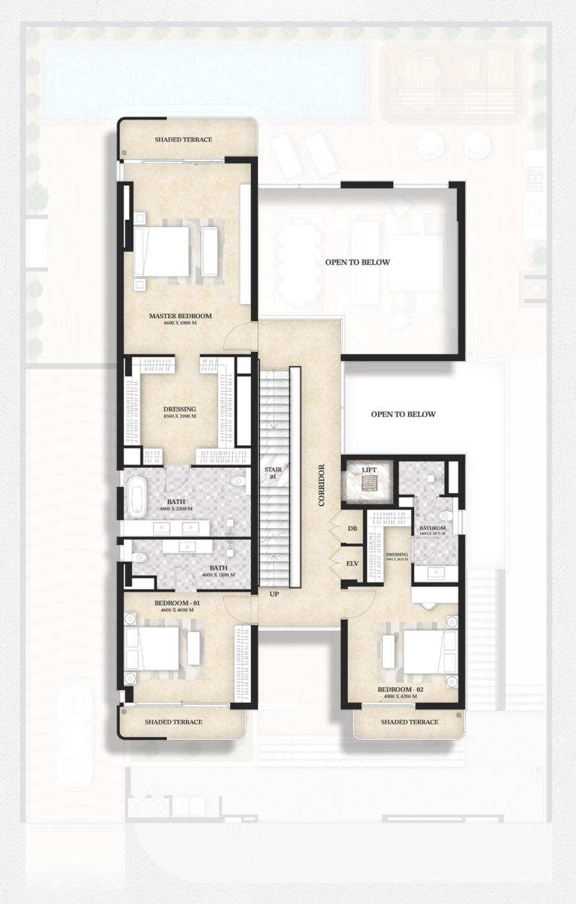 Erstes und zweites Stockwerk: Diese Etagen sind der Erholung gewidmet und verfügen über geräumige Schlafzimmer mit eigenem Bad, begehbaren Kleiderschränken und privaten Balkonen. Die Master-Suite nimmt einen Großteil der zweiten Etage ein und bietet ein Spa-ähnliches Badezimmer und eine umlaufende Terrasse.