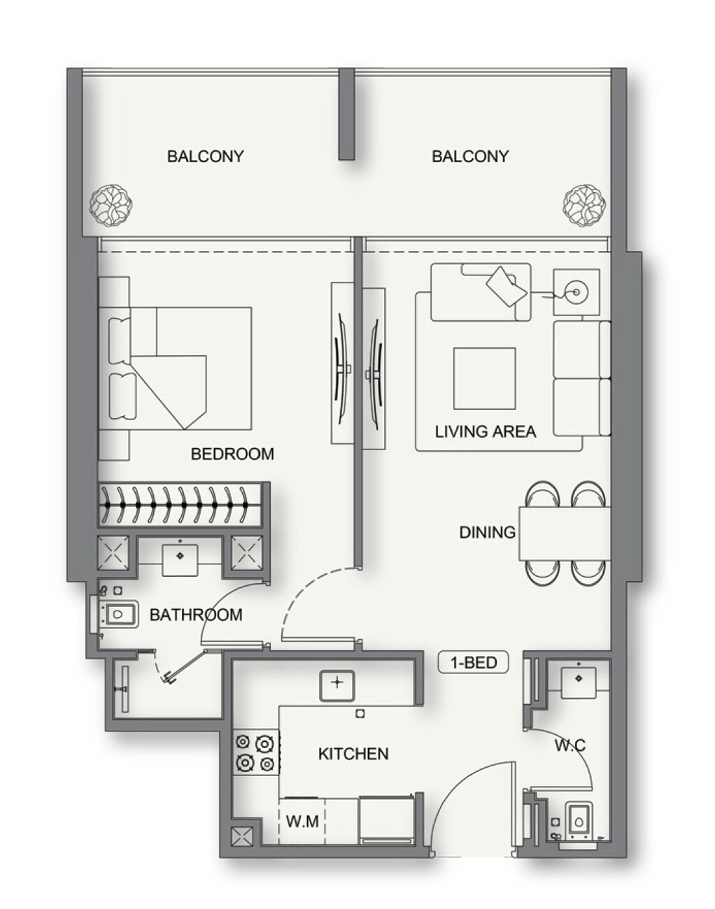 Zona de estar: Un espacioso salón-comedor de planta abierta que se abre directamente a un gran balcón, creando un flujo perfecto de interior-exterior perfecto para el entretenimiento o la relajación.