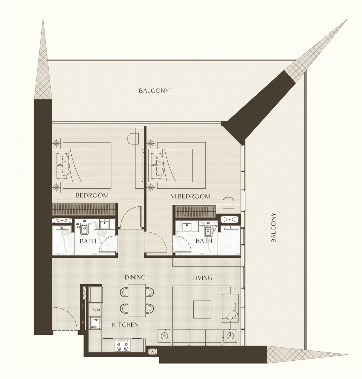 Gran balcón envolvente: La característica más destacada es el amplio balcón en forma de L que rodea toda la esquina de la unidad, accesible desde la sala de estar y que ofrece un amplio espacio al aire libre para relajarse o comer al aire libre.