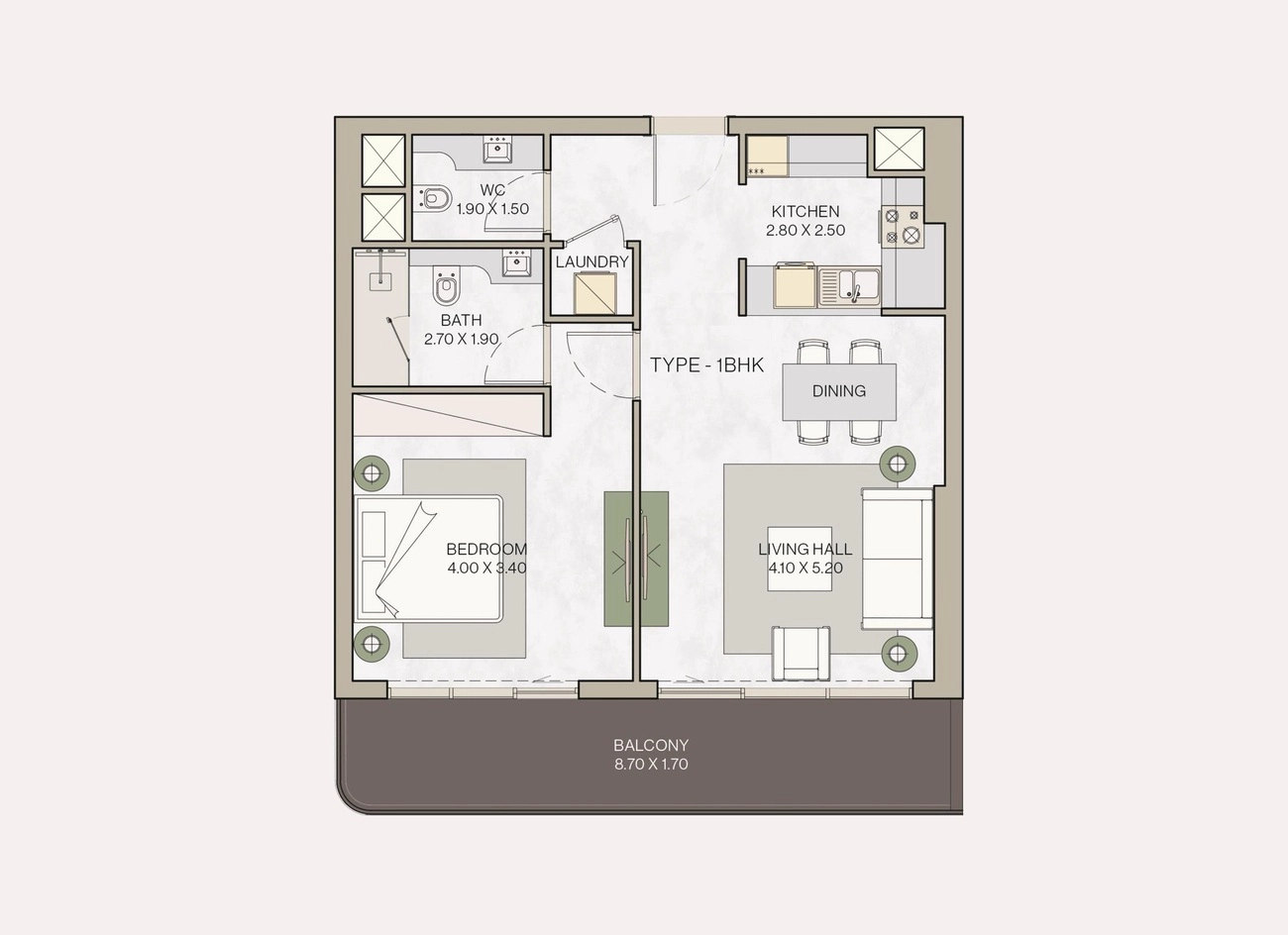 Grand Balcony: A massive 8.70 x 1.70 balcony spans the entire width of the apartment, accessible from both the living area and the bedroom, perfect for outdoor relaxation.