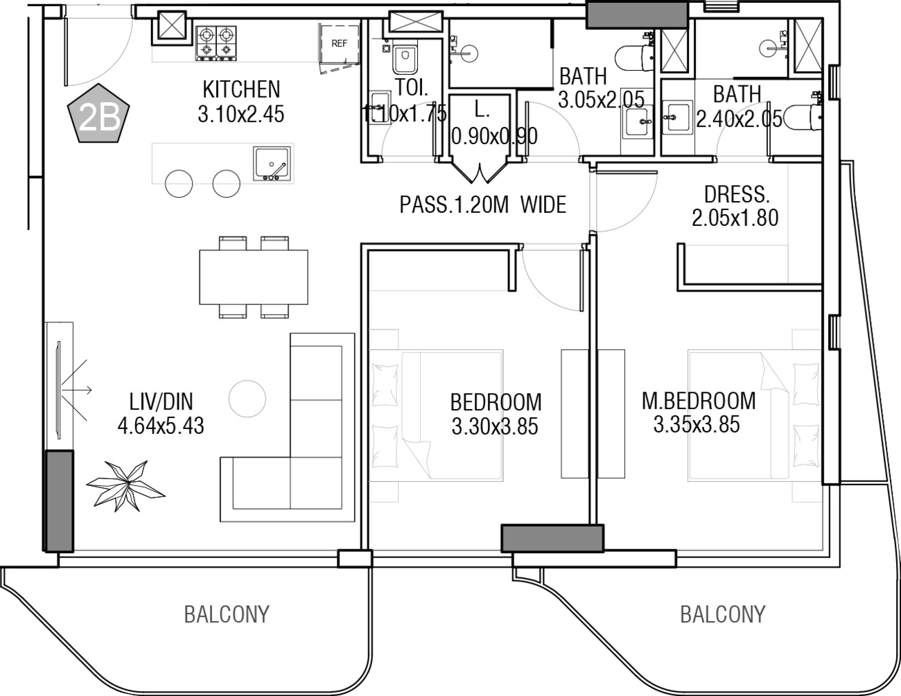 Master Suite Retreat: A grand master bedroom (3.35×3.85) featuring its own private balcony, a dedicated dressing room (2.05×1.80), and a luxurious ensuite bathroom (2.40×2.05).