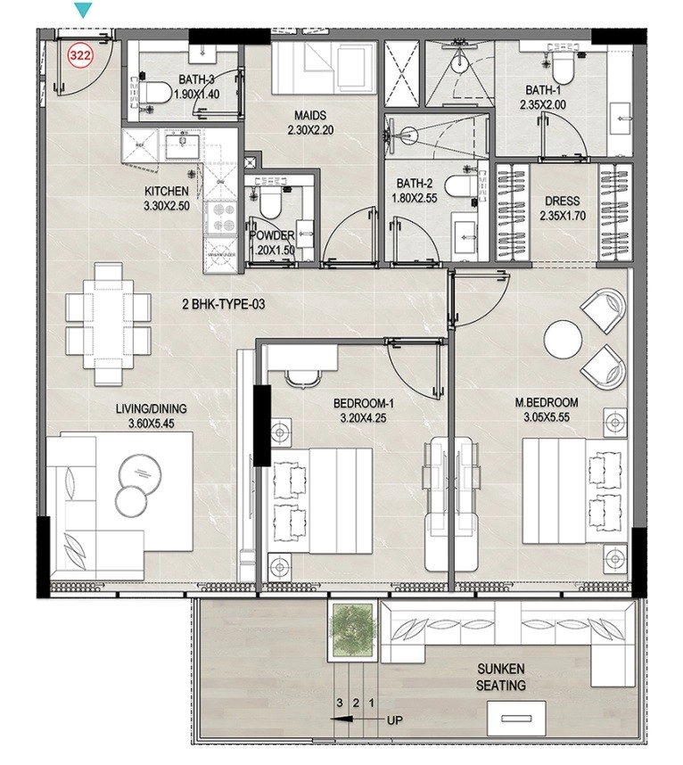 Unique Sunken Seating Area: This distinctive feature adds a layer of luxury and creates a cozy, defined space for relaxation, setting this apartment apart from typical offerings.