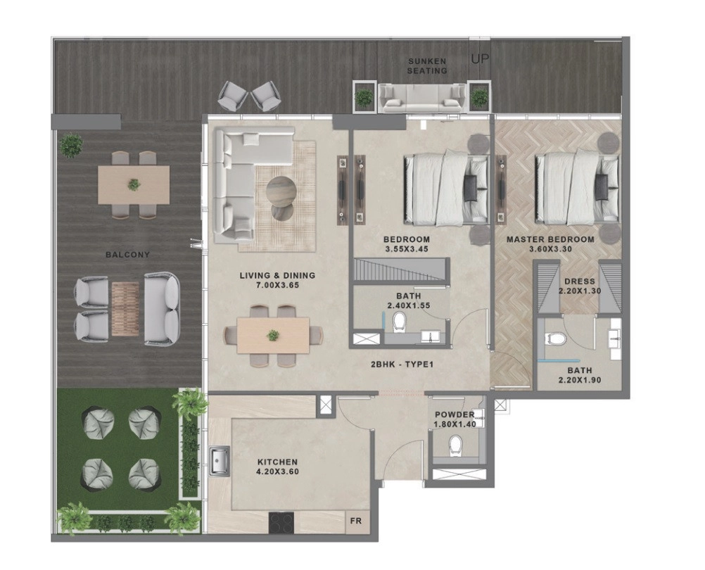 2 spacious bedrooms, including a well-appointed Master Bedroom (3.60 × 3.30 m) with its own ensuite bath and a dedicated walk-in dressing room