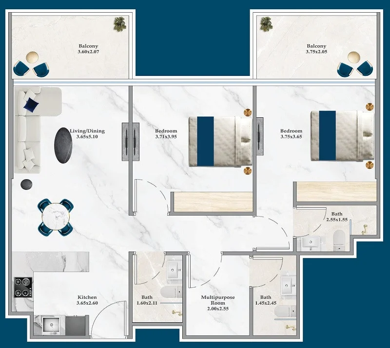 Dual Outdoor Living: Enjoy the fresh air from two separate balconies—a large Main Balcony (3.60×2.07) off the living room and a Private Balcony (3.75×2.05) attached to the master bedroom.