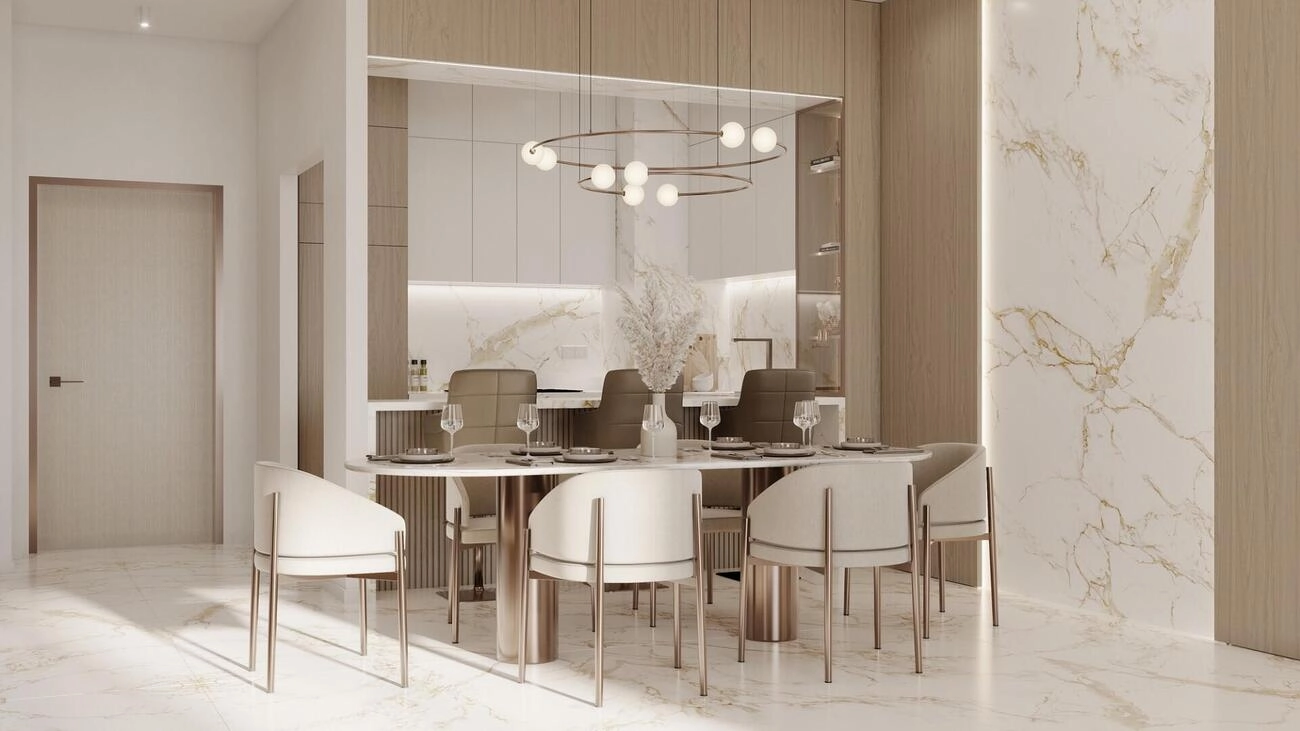 Living & Dining Area: A massive open-plan space featuring a dining area for 8 people and a cozy TV lounge. Ideal for hosting receptions.