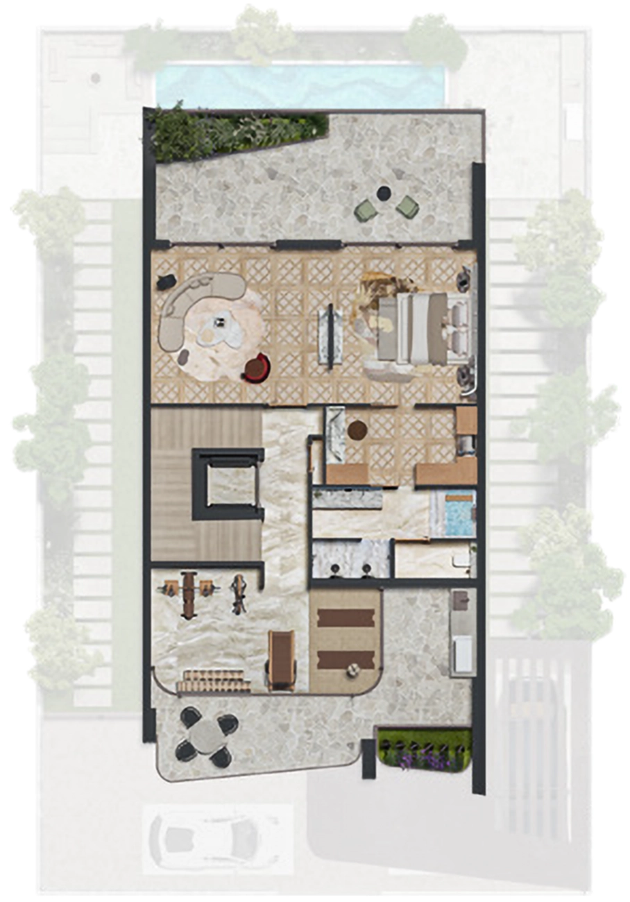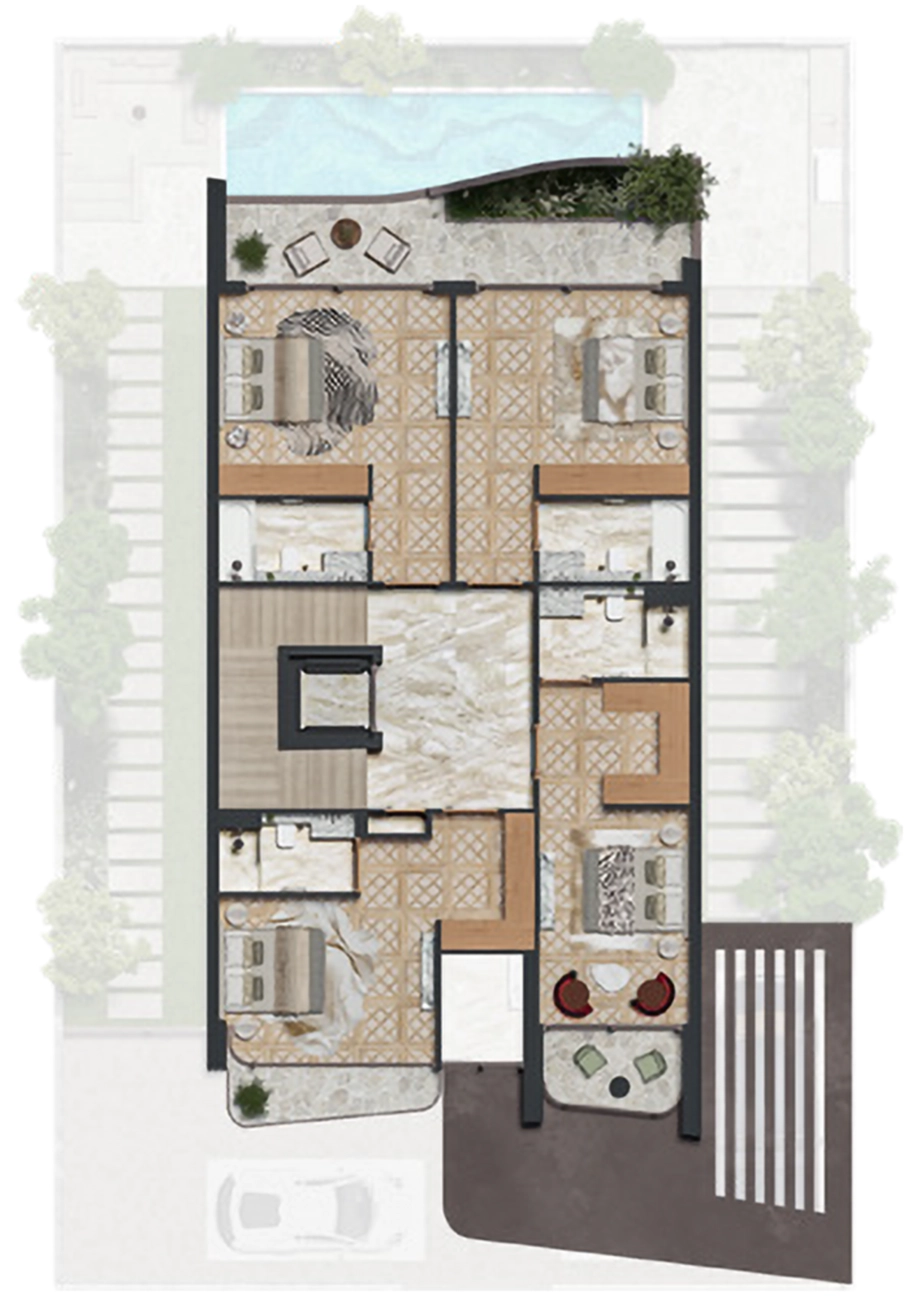 Second Floor (The Retreat): The pinnacle of the home features a massive Master Penthouse Suite with a lounge, a walk-in wardrobe, and a private gym/wellness area. It opens onto a spectacular roof terrace, perfect for evening relaxation or entertaining.