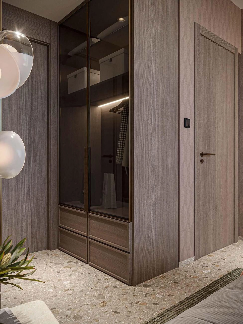 A unidade inclui uma casa de banho bem proporcionada (2,80 x 1,50 m) e um espaço de arrumação dedicado perto da entrada para manter uma estética limpa e minimalista.