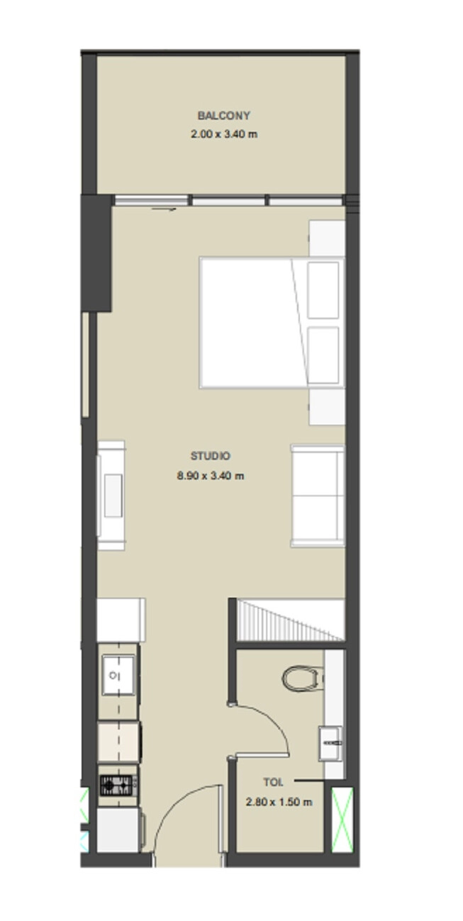 A sala de estar em plano aberto é excecionalmente espaçosa, medindo 8,90 x 3,40 m, o que permite uma transição perfeita entre a zona de dormir, a sala de estar e a zona de jantar. Uma cozinha linear moderna está eficientemente integrada perto da entrada para maximizar o espaço de vida utilizável.