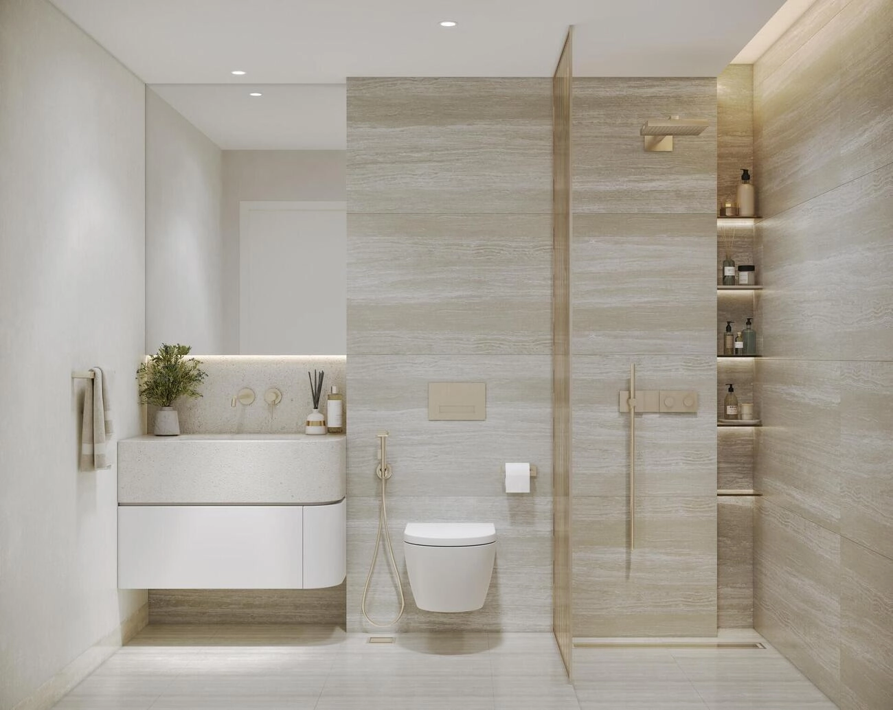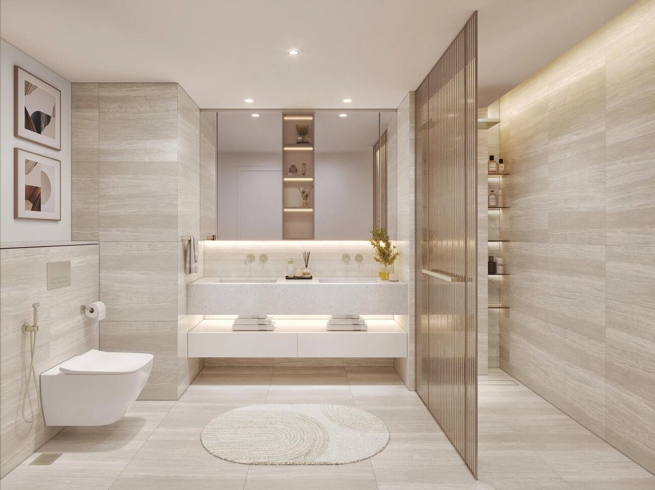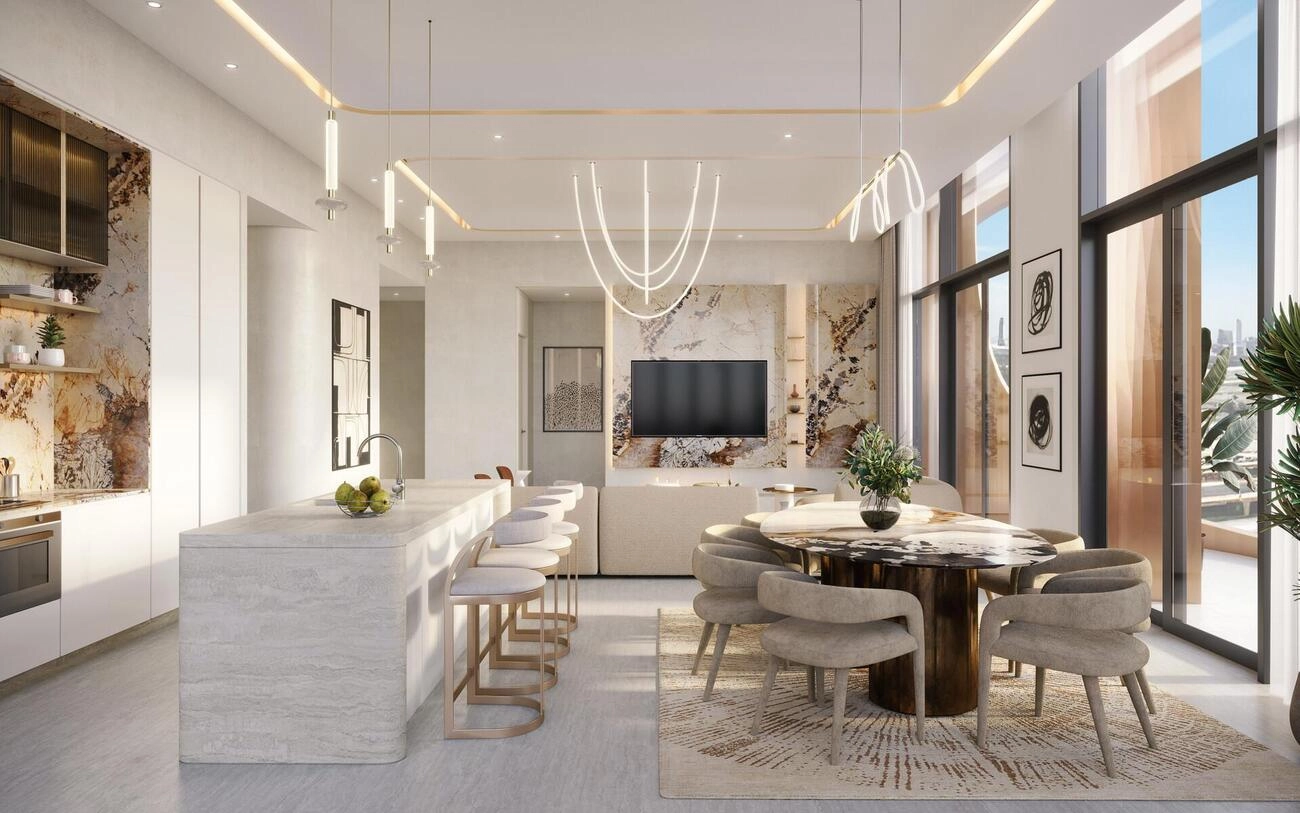 Elegante apartamento estúdio com varanda localizado em One Residence, um projeto residencial contemporâneo numa localização urbana privilegiada em Dubai, Emirados Árabes Unidos. Inclui uma varanda panorâmica curva que confere um toque de resort e amplia o espaço útil. Esta unidade foi concebida para profissionais urbanos e compradores que valorizam a luz, o design e o uso inteligente do espaço.