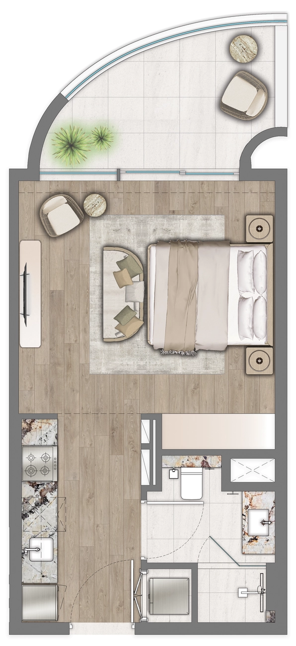 O apartamento oferece uma zona aberta para dormir e estar, uma kitchenette moderna e uma casa de banho bem equipada com acabamentos de qualidade. Uma característica de destaque é a grande varanda curva com corrimão de vidro, ideal para sentar ao ar livre e relaxar com a vista. O layout beneficia de amplas janelas panorâmicas, excelente luz natural e uma zona de entrada prática com potencial de arrumação, garantindo conforto sem desperdício de espaço.